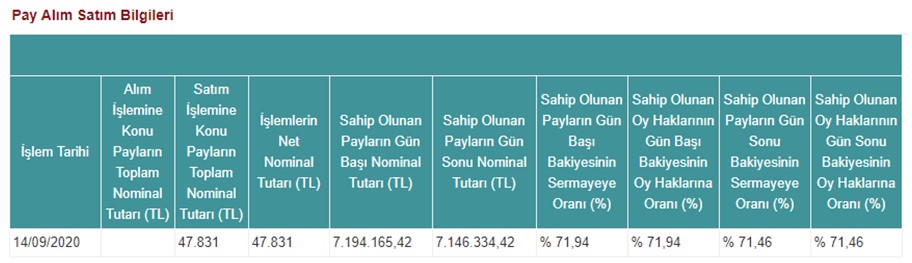 Şirketimiz, doğrudan bağlı ortaklığı Ditaş Doğan Yedek Parça İmalat ve Teknik A.Ş. hisselerinde 14.09.2020 tarihinde, 35,00 - 38,01 TL fiyat aralığından (ağırlıklı ortalama fiyat 35,62 TL) 47.831 adet satış işlemi gerçekleştirmiştir. Bu işlem ile birlikte Ditaş Doğan Yedek Parça İmalat ve Teknik A.Ş. sermayesindeki payımız 14.09.2020 tarihi itibariyle %71,46 olmuştur. Yapmış olduğumuz işlemlere ilişkin tablo aşağıda yer almaktadır;