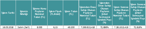 Şirketimiz' in doğrudan bağlı ortaklığı Ditaş Doğan Yedek Parça İmalat ve Teknik A.Ş. hisselerinde 16.03.2018 tarihinde (bugün) yapmış olduğu işlemlere ilişkin tablo aşağıda yer almaktadır.