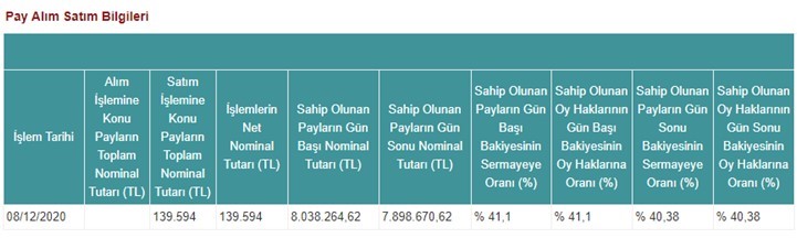 Şirketimiz, müşterek yönetime tabi ortaklığı Doğan Burda Dergi Yayıncılık ve Pazarlama A.Ş. hisselerinde 08.12.2020 (bugün) tarihinde, 24,20 - 24,74 TL fiyat aralığından (ağırlıklı ortalama fiyat 24,70 TL) 139.594 adet satış işlemi gerçekleştirmiştir. Bu işlem ile birlikte Doğan Burda Dergi Yayıncılık ve Pazarlama A.Ş. sermayesindeki payımız 08.12.2020 (bugün) tarihi itibariyle %40,38 olmuştur. Yapmış olduğumuz işlemlere ilişkin tablo aşağıda yer almaktadır;