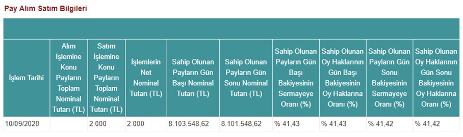 Şirketimiz, müşterek yönetime tabi ortaklığı Doğan Burda Dergi Yayıncılık ve Pazarlama A.Ş. hisselerinde 10.09.2020 (bugün) tarihinde, 23,40 TL fiyattan 2.000 adet satış işlemi gerçekleştirmiştir. Bu işlem ile birlikte Doğan Burda Dergi Yayıncılık ve Pazarlama A.Ş. sermayesindeki payımız 10.09.2020 (bugün) tarihi itibariyle %41,42 olmuştur. Yapmış olduğumuz işlemlere ilişkin tablo aşağıda yer almaktadır;