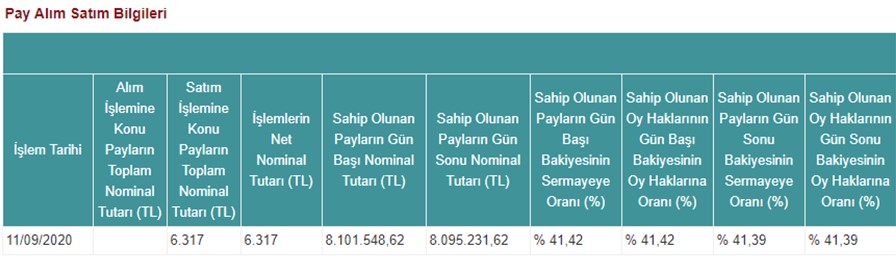 Şirketimiz, müşterek yönetime tabi ortaklığı Doğan Burda Dergi Yayıncılık ve Pazarlama A.Ş. hisselerinde 11.09.2020 (bugün) tarihinde, 23,70 TL fiyattan 6.317 adet satış işlemi gerçekleştirmiştir. Bu işlem ile birlikte Doğan Burda Dergi Yayıncılık ve Pazarlama A.Ş. sermayesindeki payımız 11.09.2020 (bugün) tarihi itibariyle %41,39 olmuştur. Yapmış olduğumuz işlemlere ilişkin tablo aşağıda yer almaktadır;
