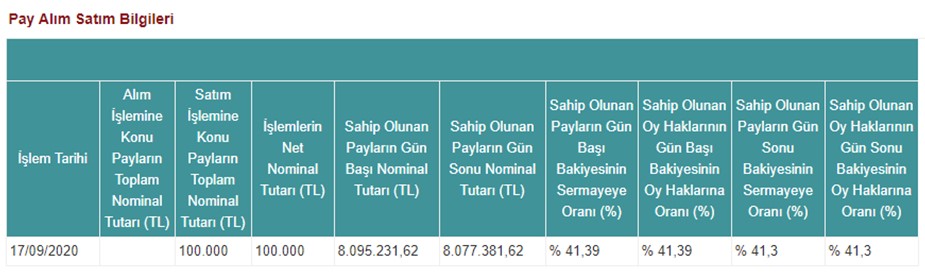 Şirketimiz, müşterek yönetime tabi ortaklığı Doğan Burda Dergi Yayıncılık ve Pazarlama A.Ş. hisselerinde 17.09.2020 tarihinde, 20,34 - 23,00 TL fiyat aralığından (ağırlıklı ortalama fiyat 21,26 TL) 17.850 adet satış işlemi gerçekleştirmiştir. Bu işlem ile birlikte Doğan Burda Dergi Yayıncılık ve Pazarlama A.Ş. sermayesindeki payımız 17.09.2020 tarihi itibariyle %41,30 olmuştur. Yapmış olduğumuz işlemlere ilişkin tablo aşağıda yer almaktadır;