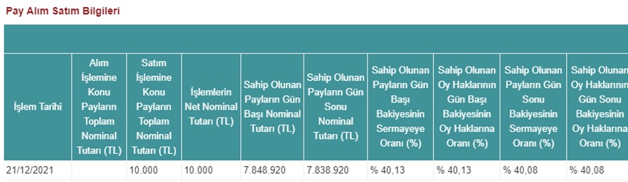 Şirketimiz, müşterek yönetime tabi ortaklığı Doğan Burda Dergi Yayıncılık ve Pazarlama A.Ş. hisselerinde 21.12.2021 tarihinde, 98,65 – 99,60 TL fiyat aralığından (ağırlıklı ortalama fiyat 99,13 TL) 10.000 adet satış işlemi gerçekleştirmiştir. Bu işlem ile birlikte Doğan Burda Dergi Yayıncılık ve Pazarlama A.Ş. sermayesindeki payımız 21.12.2021 tarihi itibariyle %40,08 olmuştur. Yapmış olduğumuz işlemlere ilişkin tablo aşağıda yer almaktadır;