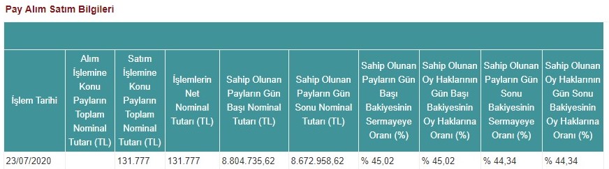 Şirketimiz, müşterek yönetime tabi ortaklığı Doğan Burda Dergi Yayıncılık ve Pazarlama A.Ş. hisselerinde 23.07.2020 (bugün) tarihinde, 20,48 - 21,74 fiyat aralığından 131.777 adet satış işlemi gerçekleştirmiştir. Bu işlem ile birlikte Doğan Burda Dergi Yayıncılık ve Pazarlama A.Ş. sermayesindeki payımız 23.07.2020 (bugün) tarihi itibariyle %44,34 olmuştur. Yapmış olduğumuz işlemlere ilişkin tablo aşağıda yer almaktadır;