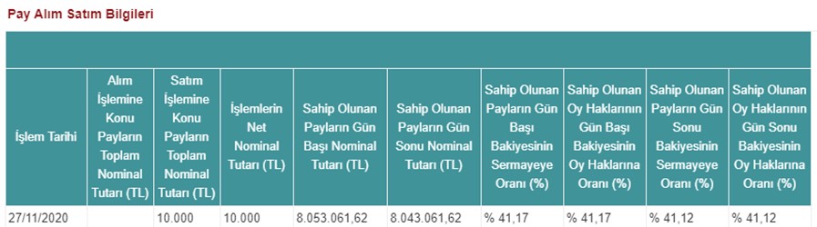 Şirketimiz, müşterek yönetime tabi ortaklığı Doğan Burda Dergi Yayıncılık ve Pazarlama A.Ş. hisselerinde 27.11.2020 (bugün) tarihinde, 22,10 ve 24,50 TL fiyattan (ağırlıklı ortalama fiyat 22,47 TL) 10.000 adet satış işlemi gerçekleştirmiştir. Bu işlem ile birlikte Doğan Burda Dergi Yayıncılık ve Pazarlama A.Ş. sermayesindeki payımız 27.11.2020 (bugün) tarihi itibariyle %41,12 olmuştur. Yapmış olduğumuz işlemlere ilişkin tablo aşağıda yer almaktadır;