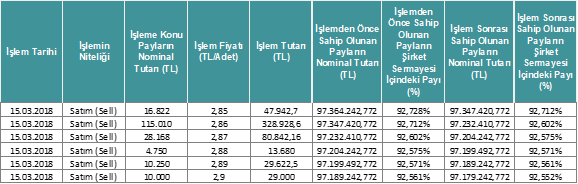 Şirketimiz' in doğrudan bağlı ortaklığı Doğan Gazetecilik A.Ş. hisselerinde 15.03.2018 tarihinde (bugün) yapmış olduğu işlemlere ilişkin tablo aşağıda yer almaktadır.