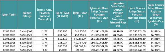 Şirketimiz' in doğrudan bağlı ortaklığı Milpa Ticari ve Sınai Ürünler Pazarlama Sanayi ve Ticaret A.Ş. hisselerinde 12.03.2018 tarihinde (bugün) yapmış olduğu işlemlere ilişkin tablo aşağıda yer almaktadır .