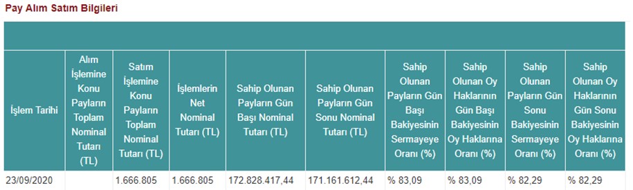 Şirketimiz, doğrudan bağlı ortaklığı Milpa Ticari ve Sınai Ürünler Pazarlama Sanayi ve Ticaret A.Ş. hisselerinde 23.09.2020 (bugün) tarihinde, 5,55 - 5,89 TL fiyat aralığından (ağırlıklı ortalama fiyat 5,69 TL) 1.666.805 adet satış işlemi gerçekleştirmiştir. Bu işlem ile birlikte Milpa Ticari ve Sınai Ürünler Pazarlama Sanayi ve Ticaret A.Ş. sermayesindeki payımız 23.09.2020 (bugün) tarihi itibariyle %82,29 olmuştur. Yapmış olduğumuz işlemlere ilişkin tablo aşağıda yer almaktadır;