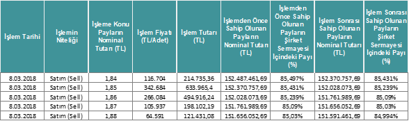 Şirketimiz' in doğrudan bağlı ortaklığı Milpa Ticari ve Sınai Ürünler Pazarlama Sanayi ve Ticaret A.Ş. hisselerinde 08.03.2018 tarihinde (bugün) yapmış olduğu işlemlere ilişkin tablo aşağıda yer almaktadır.