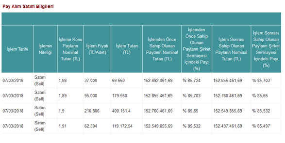 Şirketimiz' in doğrudan bağlı ortaklığı Milpa Ticari ve Sınai Ürünler Pazarlama Sanayi ve Ticaret A.Ş. hisselerinde 07.03.2018 tarihinde (bugün) yapmış olduğu işlemlere ilişkin tablo aşağıda yer almaktadır.